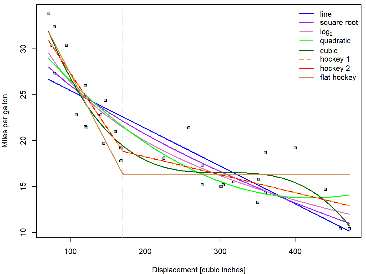 xlab = "Displacement [cubic inches]", ylab = "Miles per gallon",
