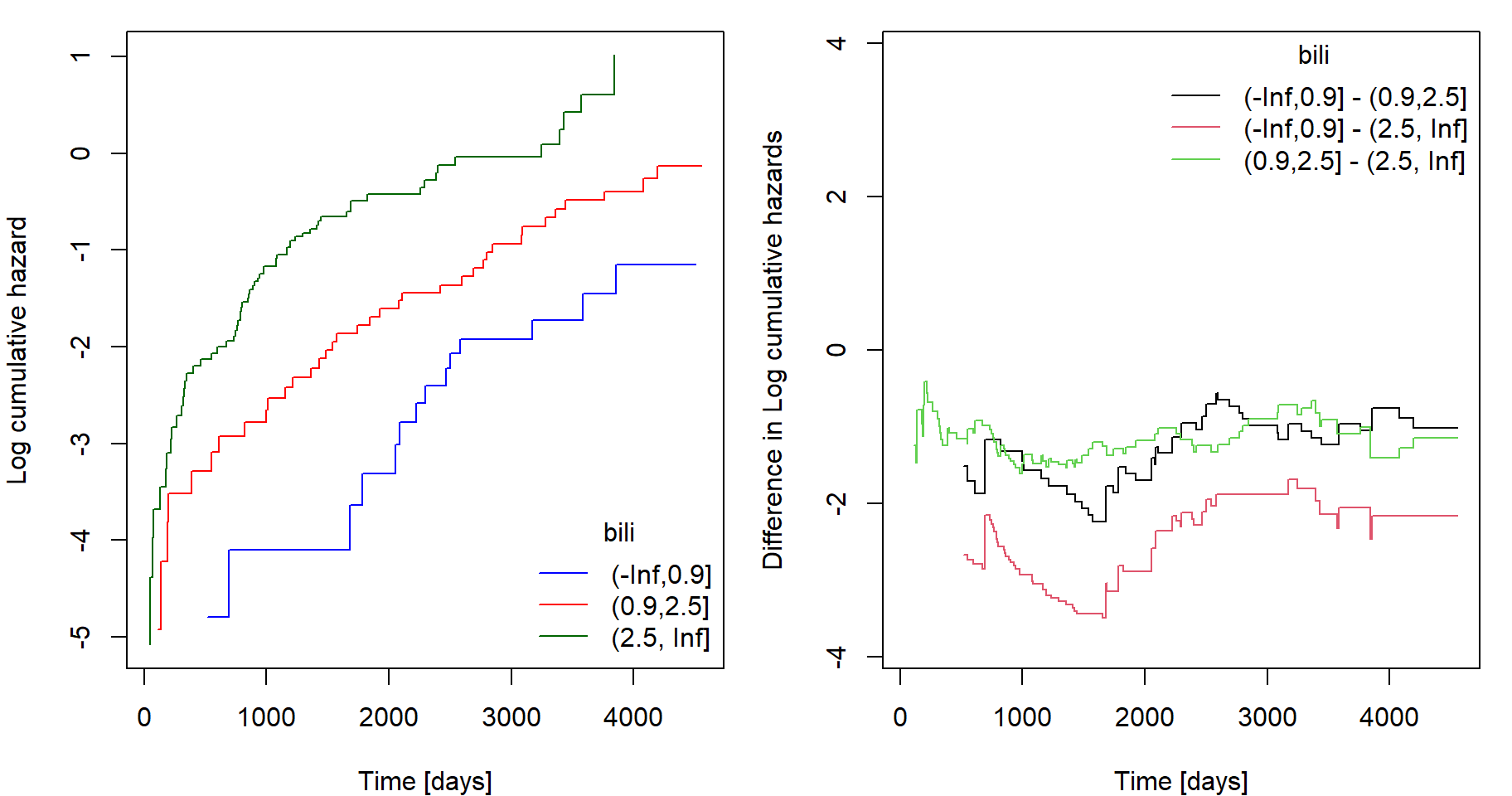 xlab = "Time [days]", ylab = "Difference in Log cumulative hazards",
