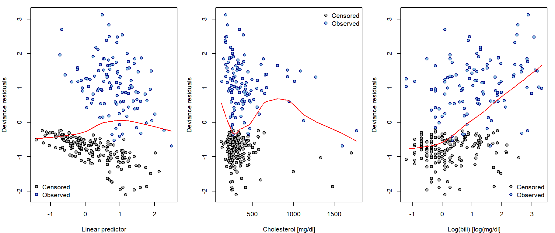 They are called deviance residuals due to their connection to model deviance (scaled difference of log-(partial)-likelihoods under current model of investigation \(\widehat{L}_c\) and the full saturated model \(\widehat{L}_f\)): \[D = -2 \left[ \log \widehat{L}_c - \log \widehat{L}_f \right] = \sum \limits_{i=1}^{n} \left( \widehat{r}_i^D \right)^2\] Although being symmetrically distributed around zero, they do not necessarily sum up to zero. Can be used similarly as Lagakos residuals:
